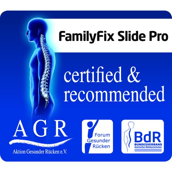 Certificată ca fiind prietenoasă cu spatele de către AGR, FamilyFix Slide Pro combină siguranța, ușurința și confortul ergonomic - soluția perfectă pentru familiile în creștere aflate în mișcare.