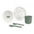 Setul de 5 piese este format dintr-o farfurie plana pentru alimente solide; un bol care este ideal pentru alimentele bebelușului, o furculiță și o lingură de dimensiunea potrivită pentru primele mese ale bebelușului, plus o ceașcă de băut.